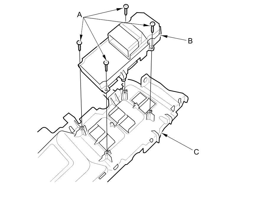 2. Remove the four screws (A), then remove the power window master switch (B) from the power window switch panel assembly (C).