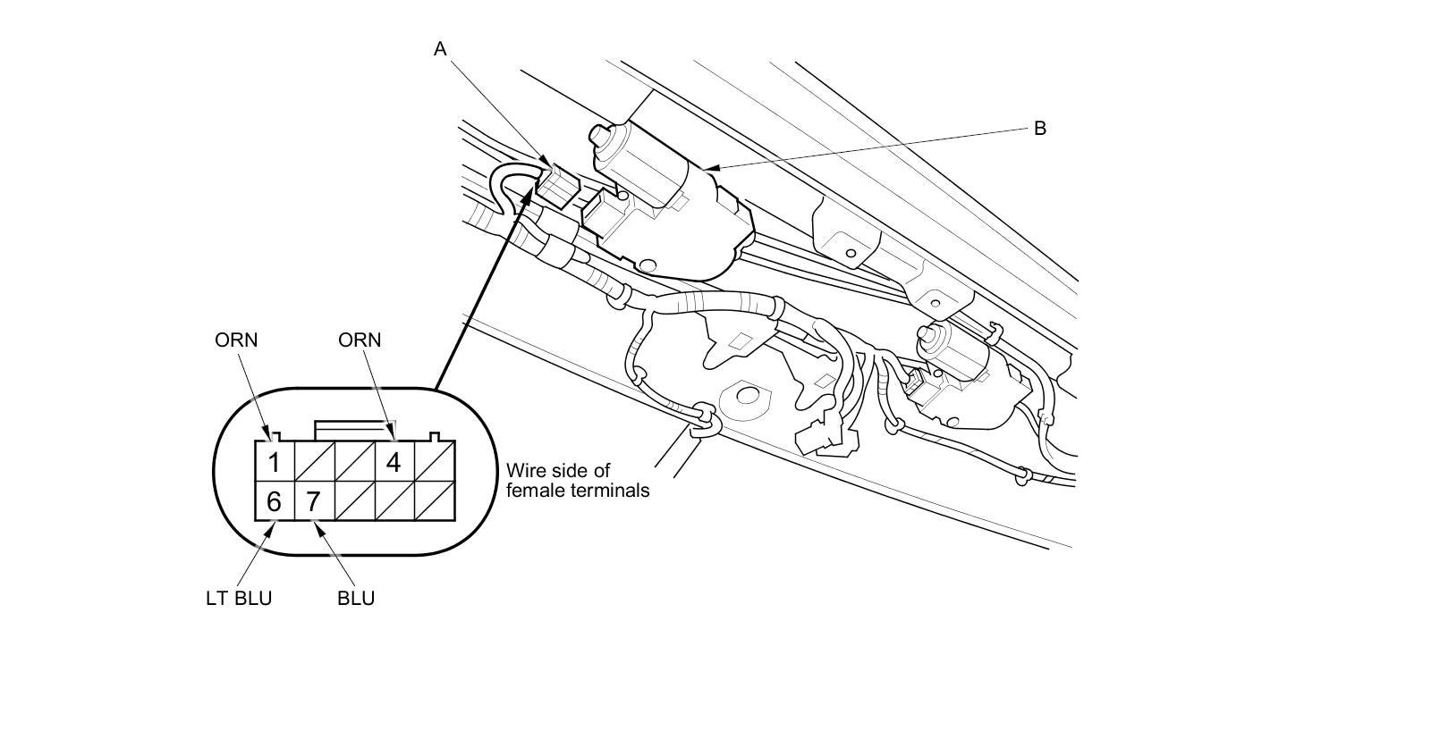 3. Disconnect the 10P connector (A) from the power sunshade control unit/motor (B).