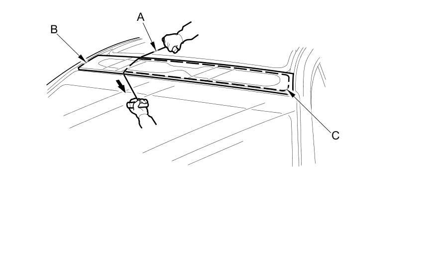 5. With a helper, pull the piano wire (A) back and forth in a sawing motion. Hold the piano wire as close to the front fixed glass panel (B) as possible to prevent damage to the body. Carefully cut through the adhesive (C) around the entire panel.