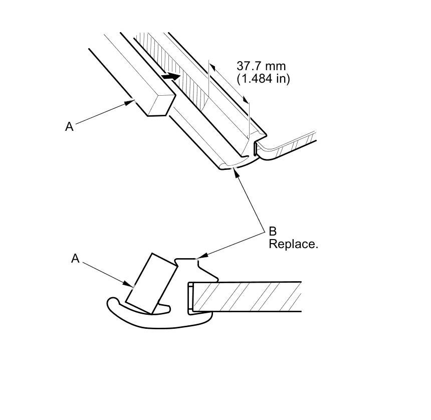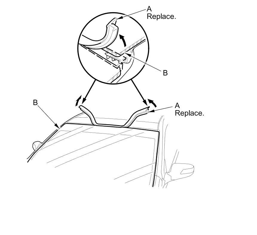 2. Remove the windshield upper molding (A) from the upper edge of the windshield (B). If necessary, cut off the molding with a utility knife.