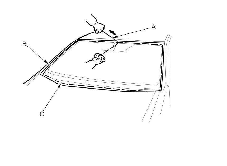 14. Attach the windshield upper molding (A) with adhesive tape (B) to the upper edge of the windshield (C). Be careful not to touch the windshield where the adhesive will be applied.