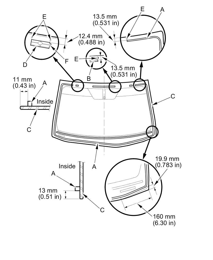 12. Apply glass primer to the upper clip mounting areas on the windshield (C), and let it dry. Remove the adhesive backing and attach the rubber dam A, B and the upper clips (D) to the inside of the windshield as shown: