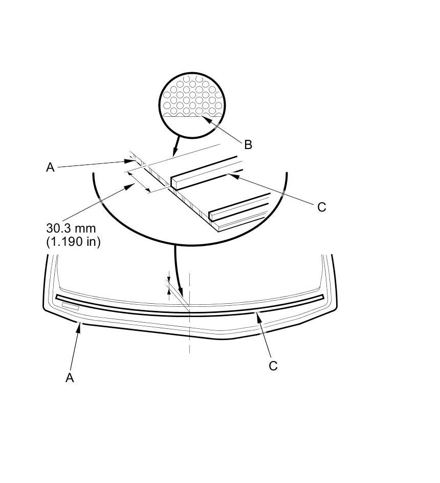 13. Attach rubber dam C with adhesive tape to the inside surface of the windshield (A) as shown, using the edge of the black ceramic-coated area (B) as a guide. Be careful not to touch the windshield where the adhesive will be applied.