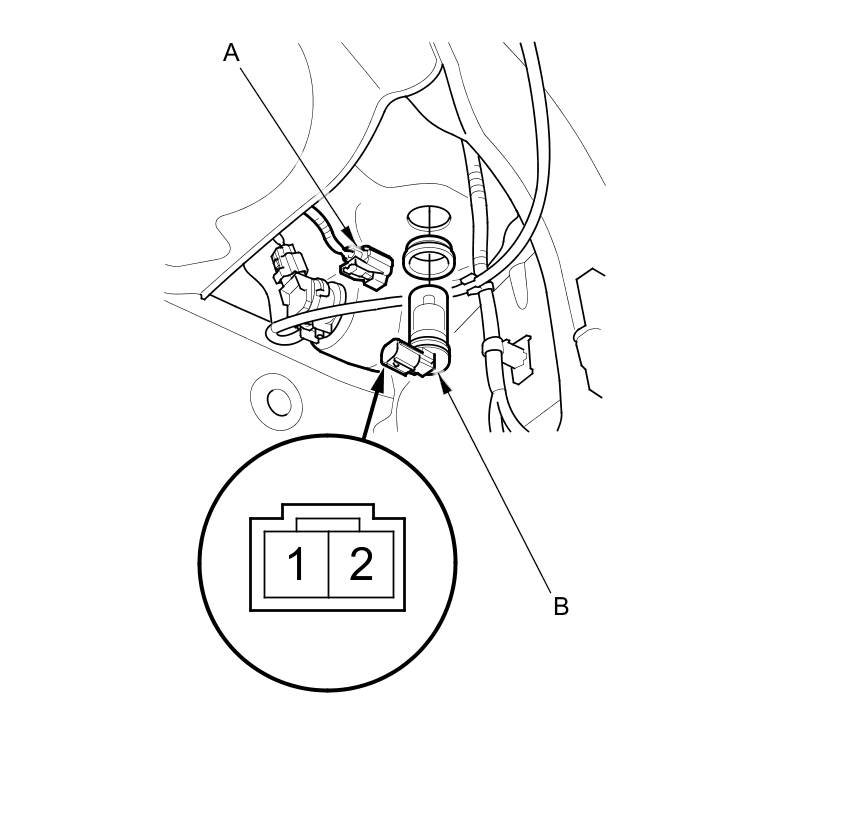 2. Disconnect the 2P connector (A) from the washer fluid level switch (B).