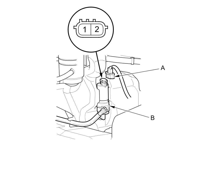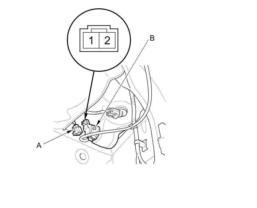 2. Disconnect the 2P connector (A) from the windshield washer motor (B).