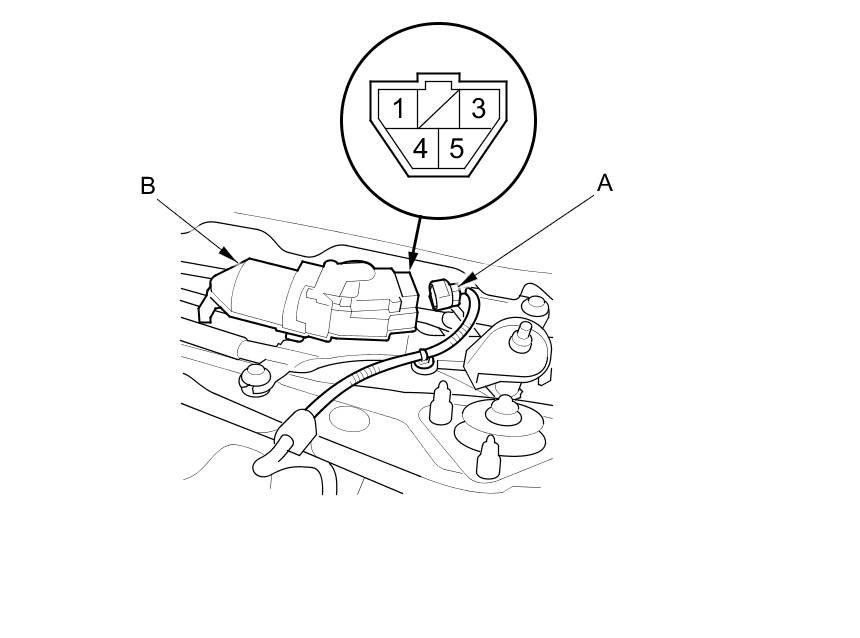 3. Disconnect the 5P connector (A) from the windshield wiper motor (B).