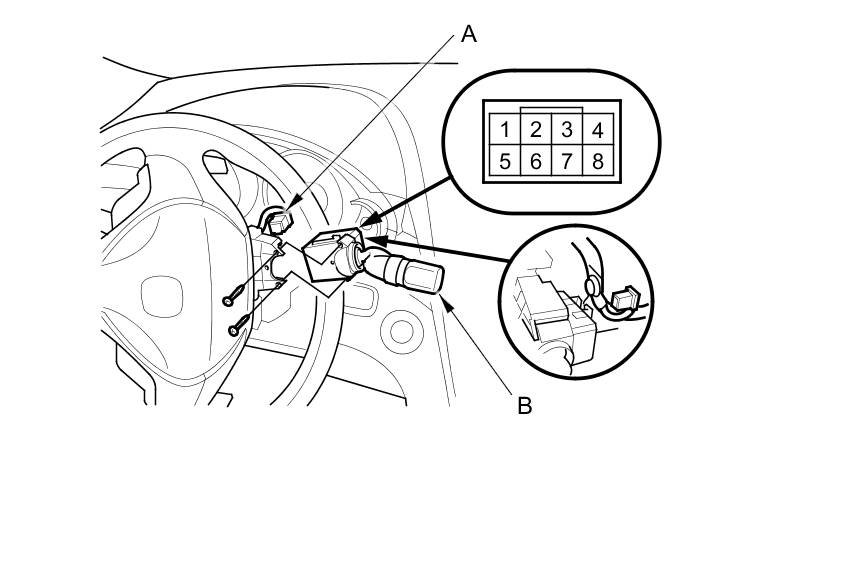 2. Disconnect the dashboard wire harness 8P connector (A) from the windshield wiper/washer switch (B).