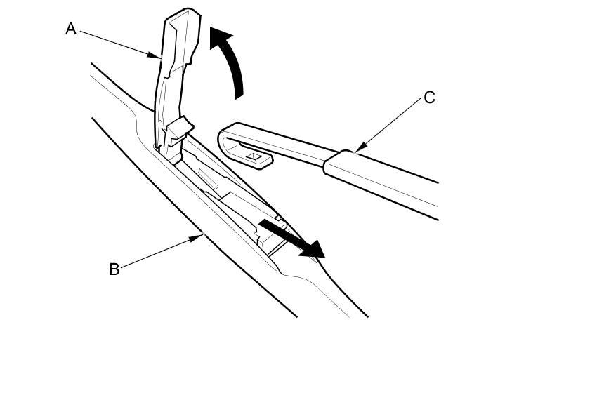 2. Pull up and hold the tab (A) and slide the wiper holder (B) toward the tab to release it from the wiper arm (C).