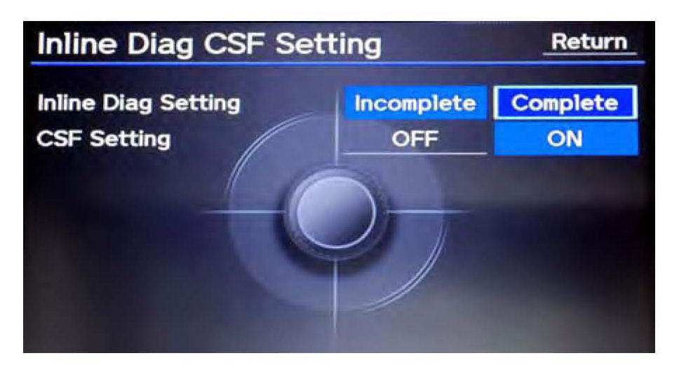 ^ Press and hold the MAP/GUIDE button until the Inline Diag CSF Setting screen appears.