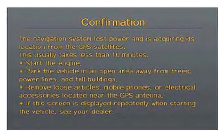 4. The instructions below appear on the screen to indicate that the system is initializing (determining its location from the GPS satellites). Follow the on-screen instructions.