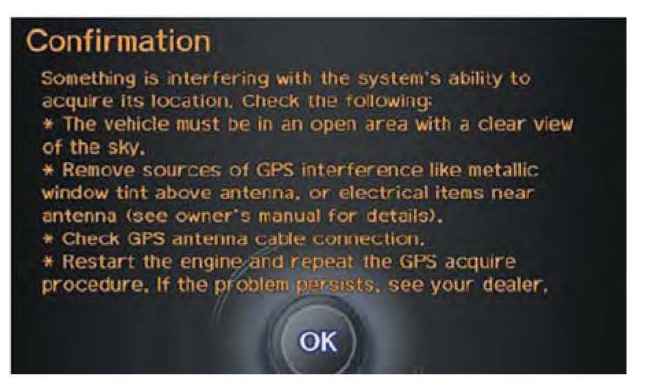 The initialization screen may appear after battery voltage to the navigation control unit has been disconnected for more than 5 minutes. If this happens, follow the on-screen instructions. If you are still unable to obtain GPS initialization, refer to the service manual for diagnostic information.