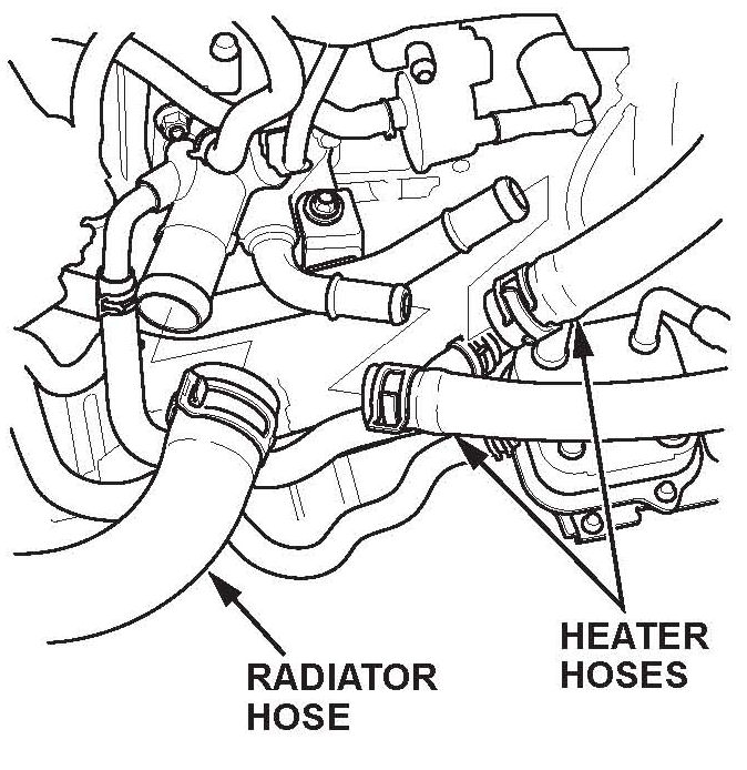 15. Disconnect the upper radiator hose, the radiator hose, and the heater hoses.