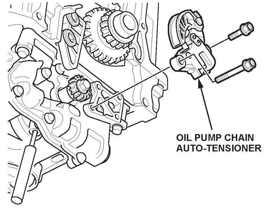 ^ Apply new engine oil to the threads of the oil pump sprocket mounting bolt, then install it and torque it to 44 N.m (33 lb-ft).