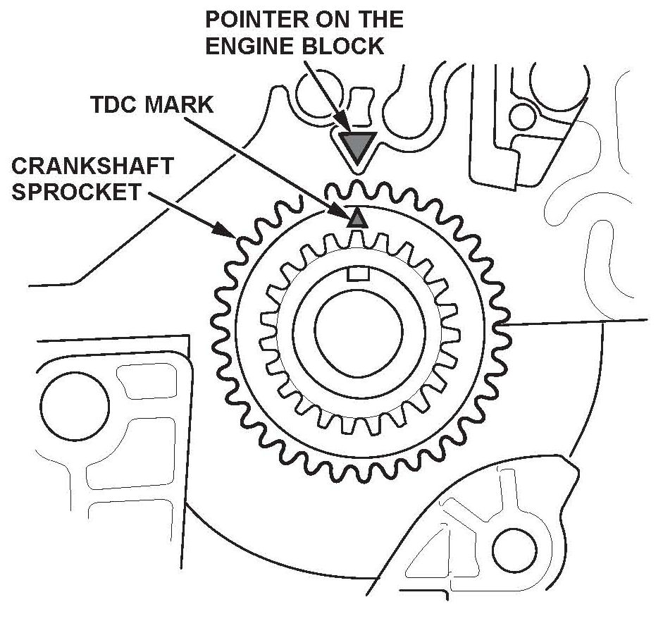 ^ Set the crankshaft to top dead center (TDC). Align the TDC mark on the crankshaft sprocket with the pointer on the engine block.