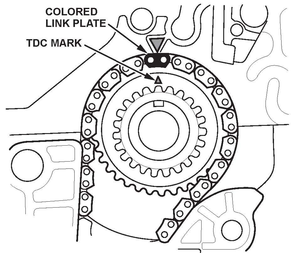 ^ Install the oil pump chain on the crankshaft sprocket with the colored link plate aligned with the TDC mark on the crankshaft sprocket.