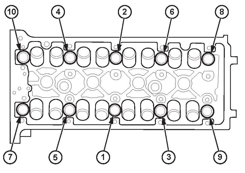 ^ After torquing, tighten all cylinder head bolts in two steps (90° per step) using the sequence shown above. If you are using a new cylinder head bolt, tighten the bolt an extra 90°.