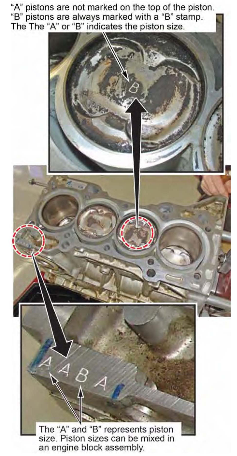 Every engine has some combination of A- and B-sized pistons. You can determine the sizes and their locations in the block by inspecting the markings on the timing chain end of the engine block or by looking at the pistons.