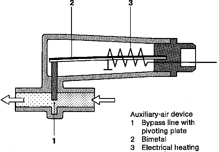 The auxiliary air device is an electrically operated valve which allows air to bypass the closed throttle plate during cold engine operation. The additional air compensates for mixture enrichment provided by the cold start valve and control pressure regulator and provides a "fast idle" to prevent stalling during warm up. The valve opening is controlled by a bi-metallic element which responds to temperature, and the element is heated both by engine heat and an internal heating coil.