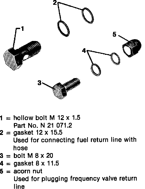 12. Use the 12 X 1.5 banjo bolt, and copper washers to attach the flexible line to the banjo fitting on the solid line (the line previously connected to the frequency valve), to direct the fuel flow into a graduated container.