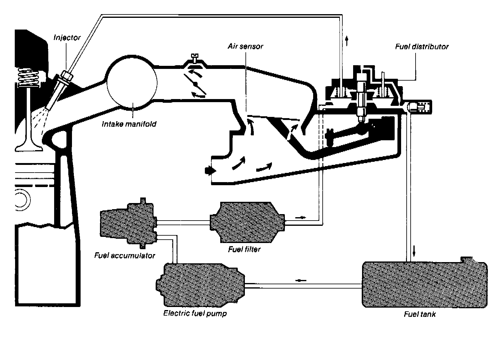 The fuel supply system for C.I.S. fuel injection consists of an electric fuel pump which pumps fuel at high pressure from the fuel tank, a fuel filter and a fuel accumulator. Excess fuel from the fuel distributor returns to the fuel tank through return lines at very low pressure.