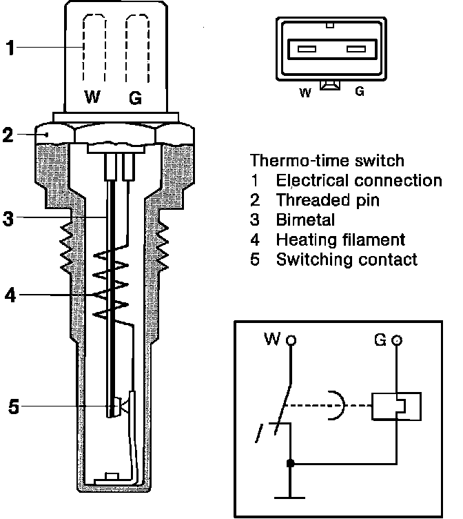 When the engine coolant is below the switch calibration temperature, the thermo time switch is closed completing the cold start valve ground circuit. During cranking battery voltage is applied to both the cold start valve and timing switch, and the start valve injects fuel into the manifold. After 3 - 10 seconds, voltage applied to the thermo time switch heats an internal element which expands opening the cold start valve ground circuit and the cold start valve is de-energized. When coolant temperature exceeds the switch calibration temperature, the switch remains open and the cold start valve does not operate.