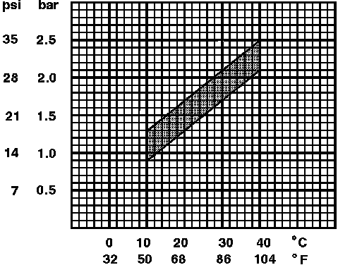 c. Control pressure (regulator with two vacuum hoses), warm (vacuum hoses OFF, and 0.5 bar (38 cm Hg) vacuum applied to small connection) -- 1.4 - 1.8 bar (20 - 26 psi)