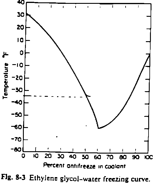 Graph shows the freezing points of various antifreeze/water concentrations.