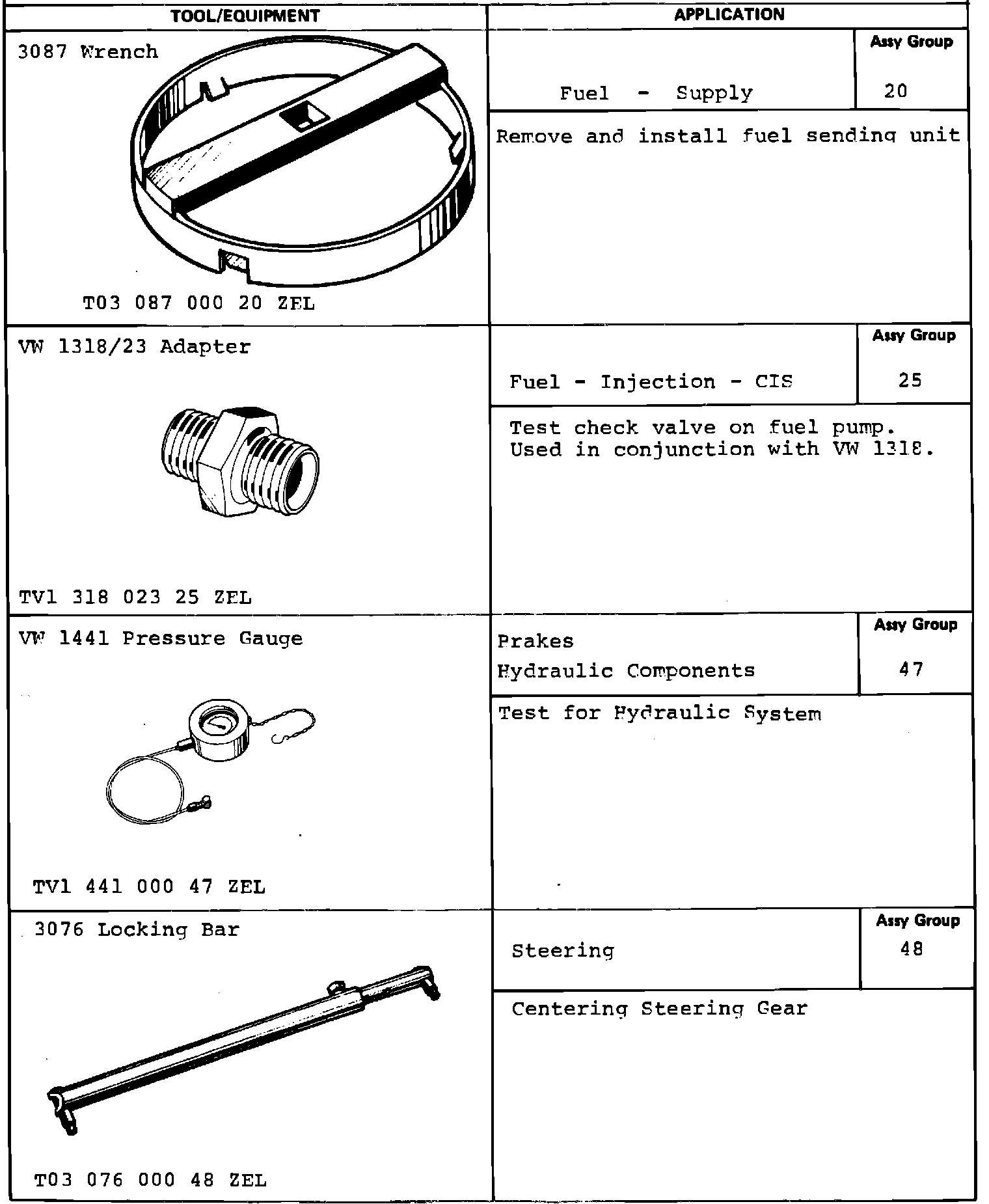 The special tools are listed on the attachment along with price and vehicle application information. Six (6) tools are considered Minimum Requirement and one (1) as optional Requirement. One special tool package will be shipped to every Audi dealer participating in the Automatic Supply Program the week of April 25, 1983.