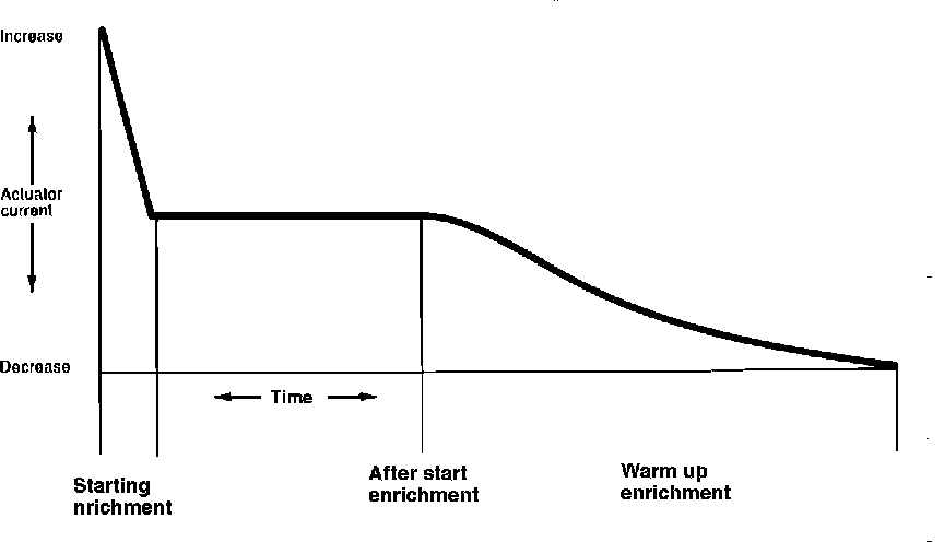 When the starter is activated, the current to the differential pressure regulator is increased to enrich the fuel mixture, Fig. 1.. The enrichment supplements the operation of the cold start valve if the engine is cold. The amount of starting enrichment is dependent on the engine coolant temperature. Regulator current can briefly go to its maximum value if the engine is cold (maximum starting enrichment time is 1.5 seconds). To test the system: