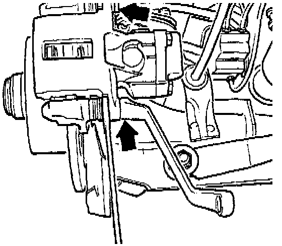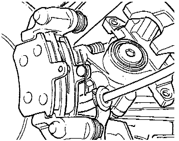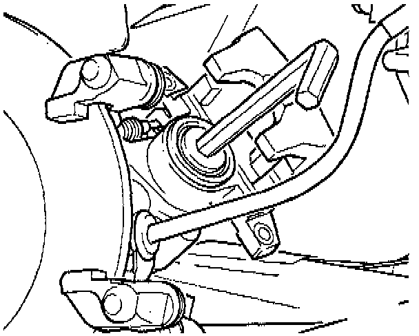 3. Lift caliper assembly upward from rotor and secure to frame with wire. It is not necessary to disconnect brake hose when replacing pads.