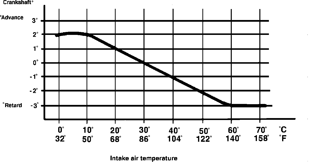 When the intake manifold pressure is above 1.0 bar (above 0 psi boost), the intake temperature is used to calculate ignition timing correction. The normal timing will be either advanced or retarded, depending on intake air temperature. As the temperature increases with increased boost, the ignition timing will be retarded to prevent detonation, and possible engine damage, Fig. 44.