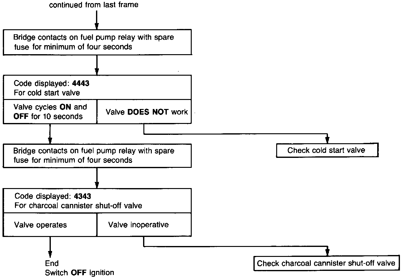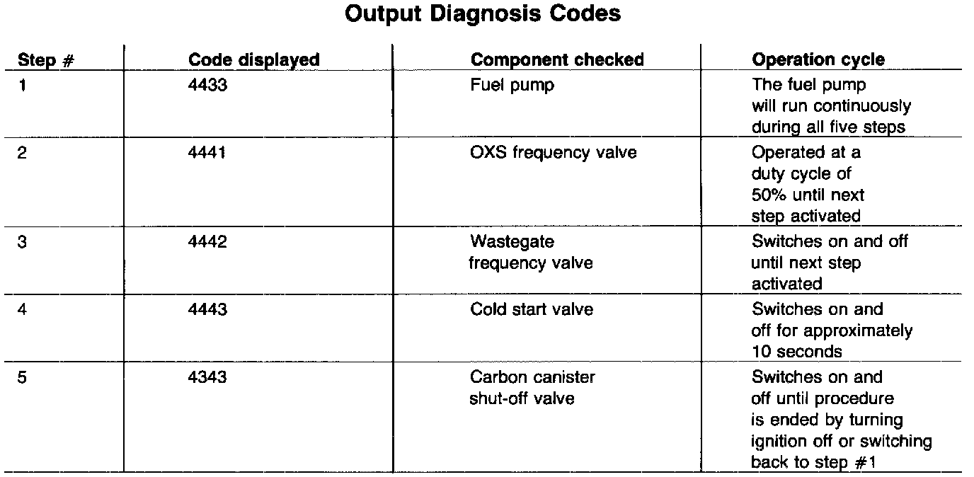The control unit's circuitry can now also check the operation of certain components by generating specific output signals. This is the second part of the diagnosis procedure. To activate this part of the diagnosis procedure, a certain sequence must be followed. During the tests, the components can be checked by listening to see if they are operating. If a problem is found, first check the component's resistance with an ohmmeter for a short or open circuit before checking the wiring or control unit. Refer to the Repair Manual microfiche.
