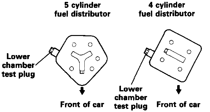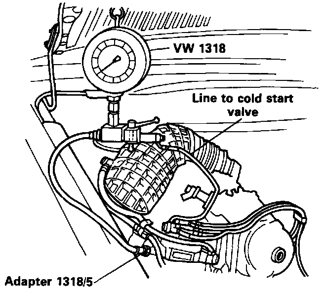 - Connect VW 1318 pressure gauge between the fuel line at the cold start valve and lower chamber test connection on the fuel distributor