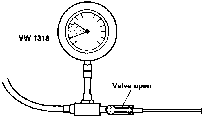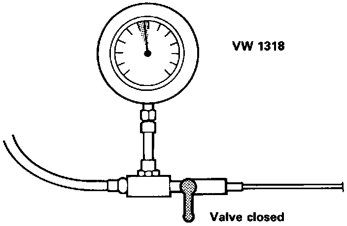 - Close valve on VW 1318 pressure gauge (wiring connector for differential pressure regulator remains disconnected)