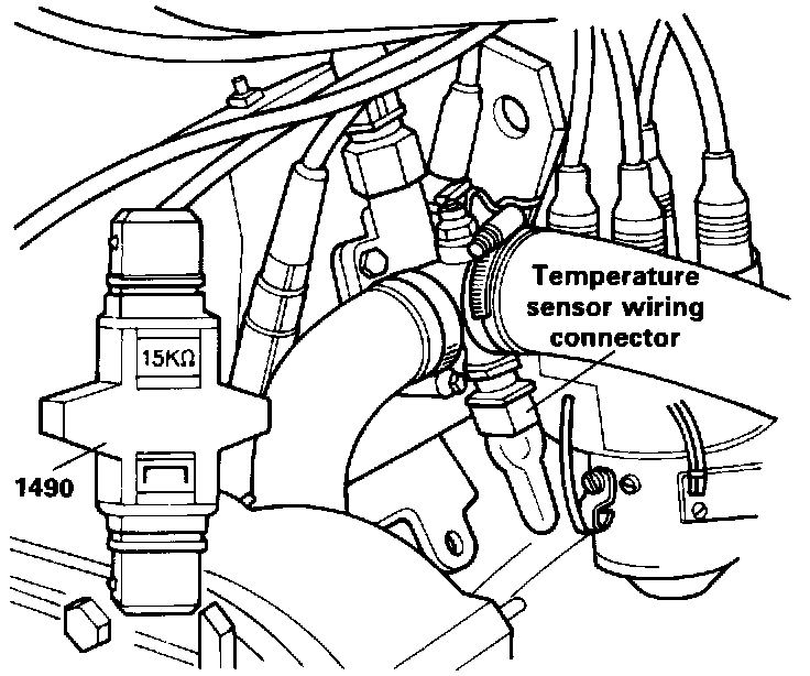 - Connect 15 kohms side of tool 1490 to temperature sensor wiring connector. Side remains disconnected.