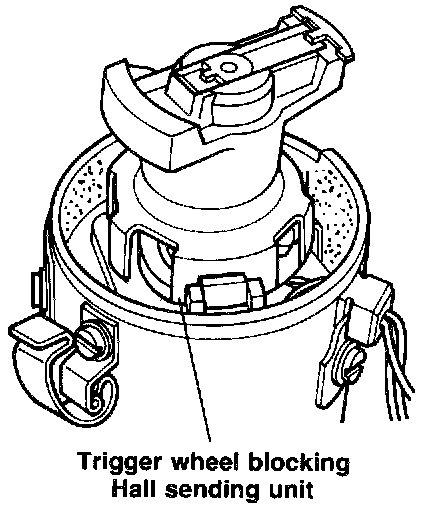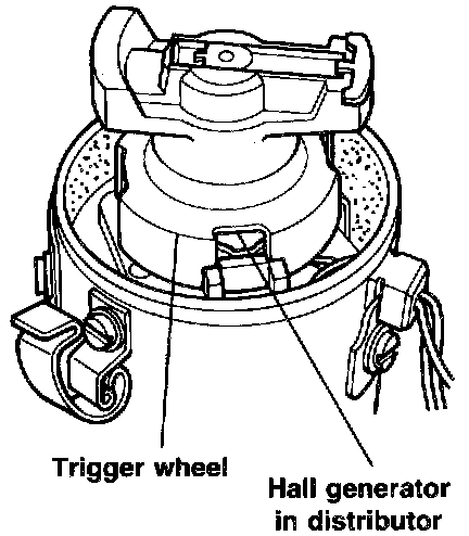 Located in the distributor is a device called the Hall Sending unit. The Hall Sending unit consists of a semiconductor with integrated circuitry and a magnet. The trigger wheel on the distributor shaft acts as a magnetic barrier in the Hall Sending unit. The purpose of the Hall Sending unit is to generate a voltage pulse which is used to trigger the ignition control switch.