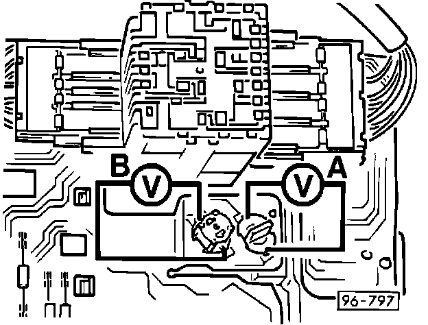 - connect voltmeter between contact 9 of connector B (white band) and contact 5 of printed circuit
