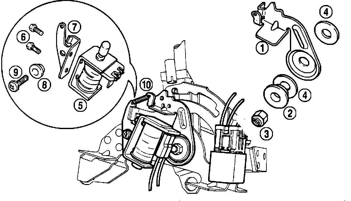 - secure solenoid bracket (7) to selector lever bracket with machine screw (9) which has been first inserted into small step washer (8)