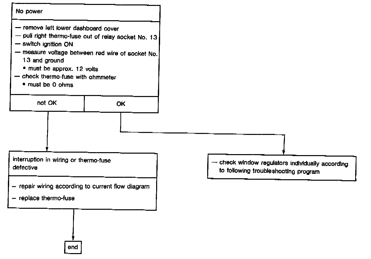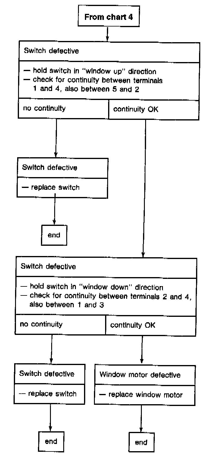 If window motor of drivers door needs to be renewed, note wiring colors according to current flow diagram. Also check operation of window motor relay by pressing left front window briefly into "window down" position. Window must continue to go automatically to end position.
