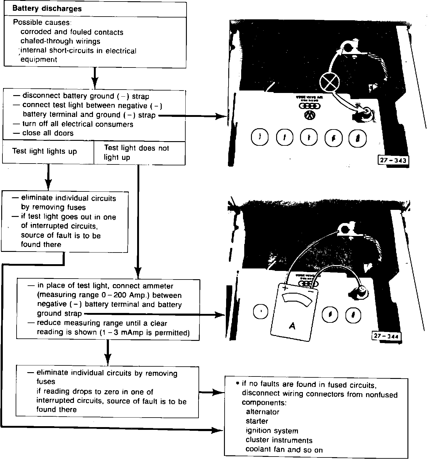 If complaint "battery not being charged" is received although warning light comes on when ignition is switched on and goes out when ignition is switched off, resistance for exciter current should be checked as follows: