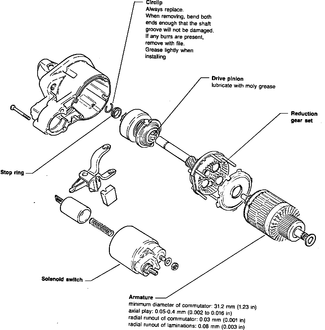 When turning the commutator, undercut the insulating mica 0.5 to 0.8 mm (0.02 to 0.03 in), then finish turning
