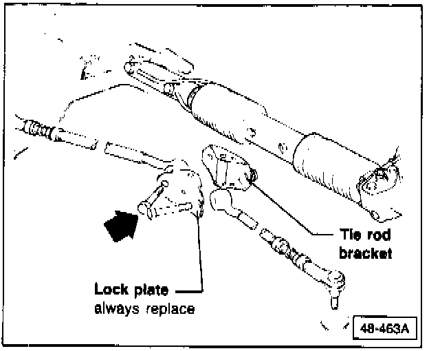 - return steering wheel to original position and install tie rod bracket, tie rods, NEW lock plate, and start tie rod bolts into steering rack threads.