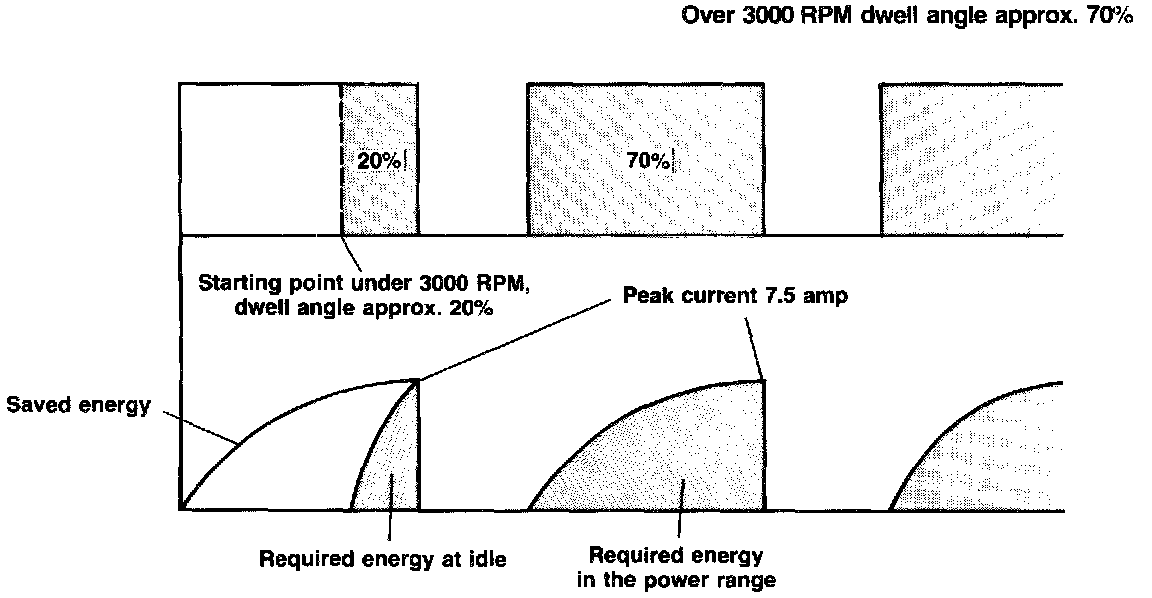 At low engine speeds, the control unit delays the start of primary current. This process causes a decrease in the dwell angle (approx. 20%). The 7.5 amp maximum current is reached in a shorter period of time, thus reducing the ignition load and maintaining current consumption at its lowest level.