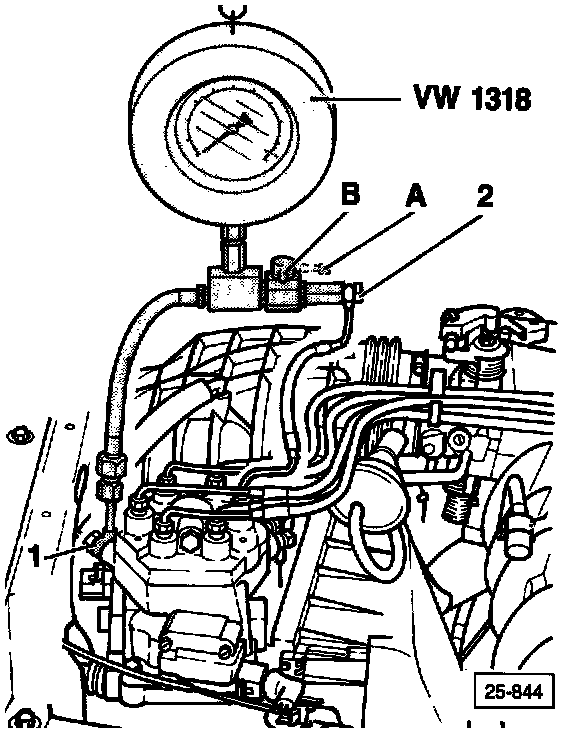 - connect pressure tester VW 1318 to measuring location 1 on fuel distributor using adaptor VW 1318/4