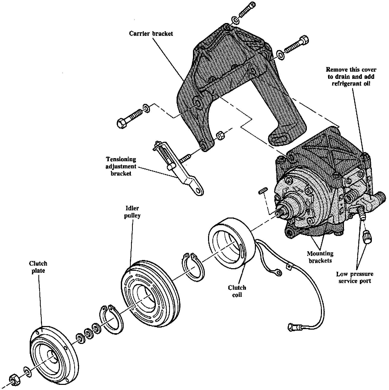 : When installing a new compressor, remove the low pressure port cover and drain oil from compressor. Add the above amount of new