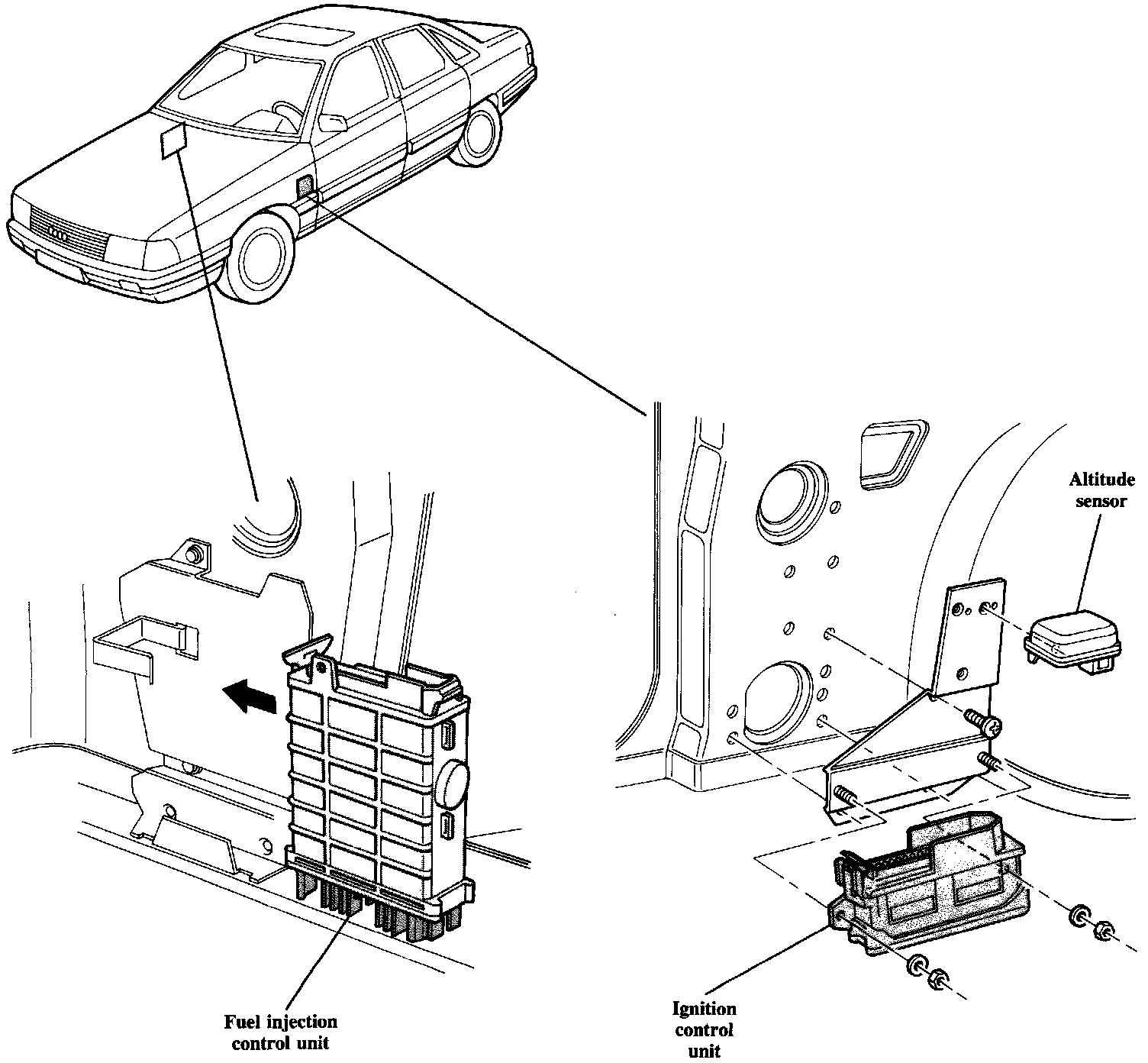 The CIS-E III engine control system uses two separate control units. The control units are located behind the right and left kick panels. They are connected together electrically by the vehicle's wire harness.