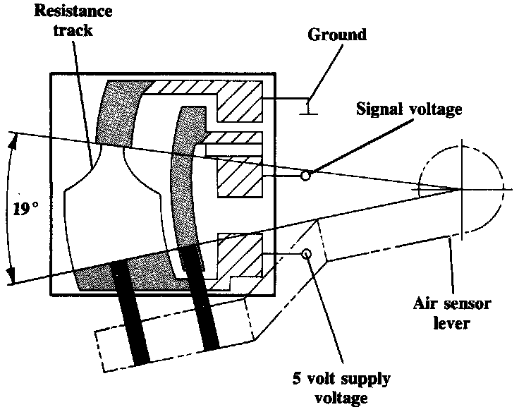 The air sensor potentiometer is connected to the air sensor lever. It generates a voltage signal based on the position of the air sensor plate. This signal is used by the fuel injection control unit to determine cold acceleration enrichment.