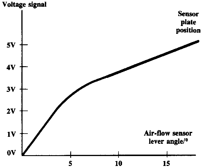 The ignition control unit also uses this voltage signal to determine ignition timing. By measuring the position of the air sensor plate, the ignition control unit can determine engine load. This value, together with engine speed, is used to determine ignition timing.