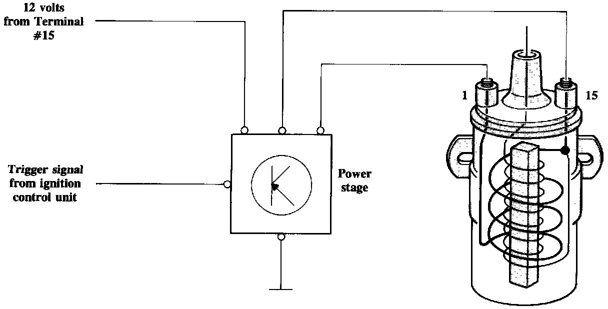 The ignition control unit sends a voltage signal to the power stage to operate it. The power stage will then switch the ignition coil primary current to control the spark discharge from the ignition coil. In this manner the power stage operates like a solid state pair of ignition points.