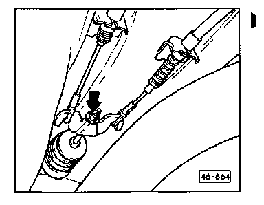 Loosen adjustment nut for parking brake cable (arrow) until both levers rest against stop